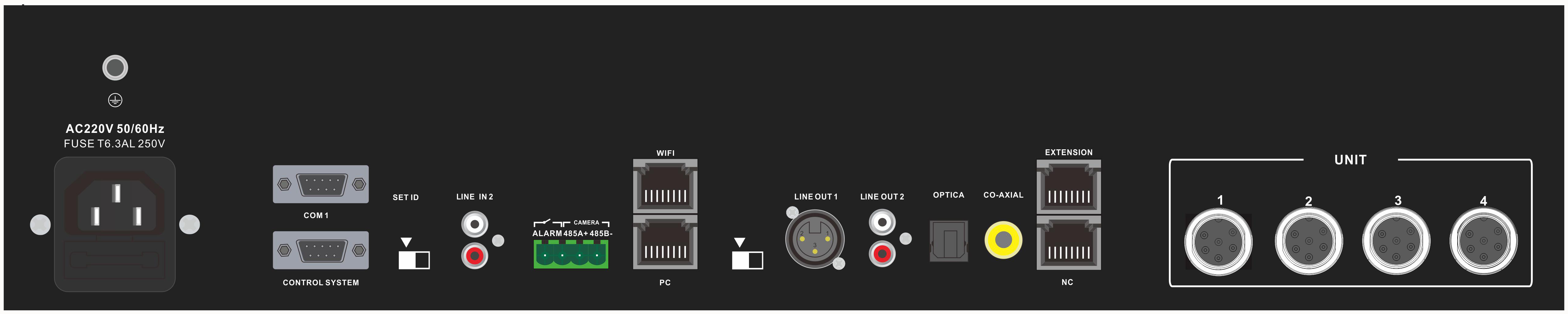 10、支持RS232中控控制,实现话筒开关,优先权,音量大小,关机等控制。