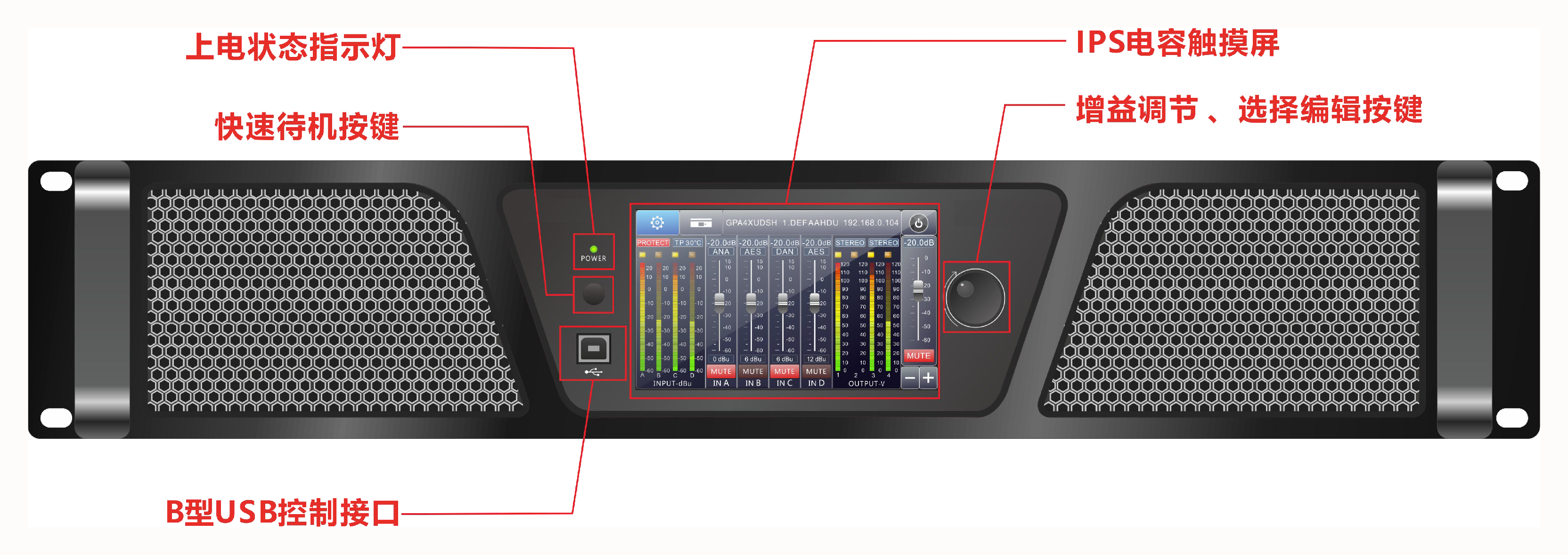 ◆ 输入灵敏度三档可调0dBu/6dBu/12dBu,软件或彩液晶屏设置