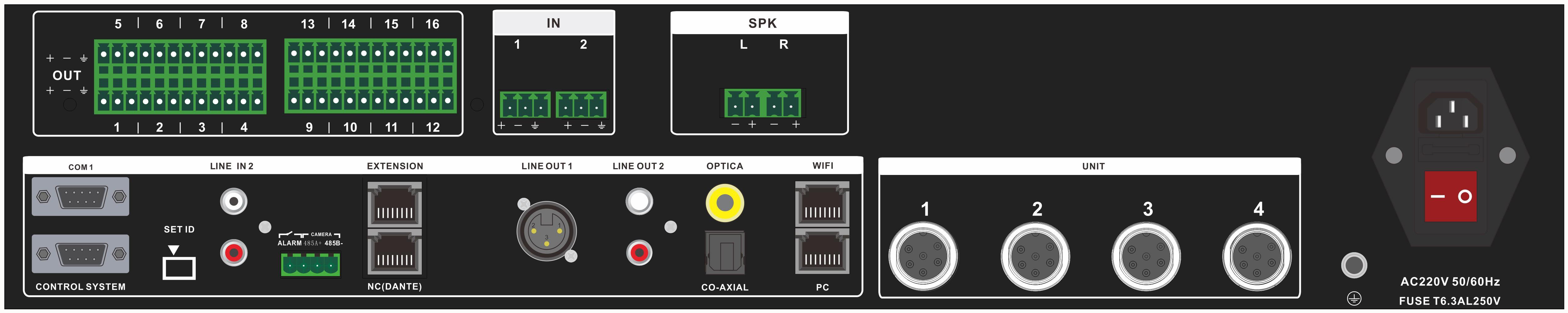 9.DANTE口:对接DANTE协议的外部设备