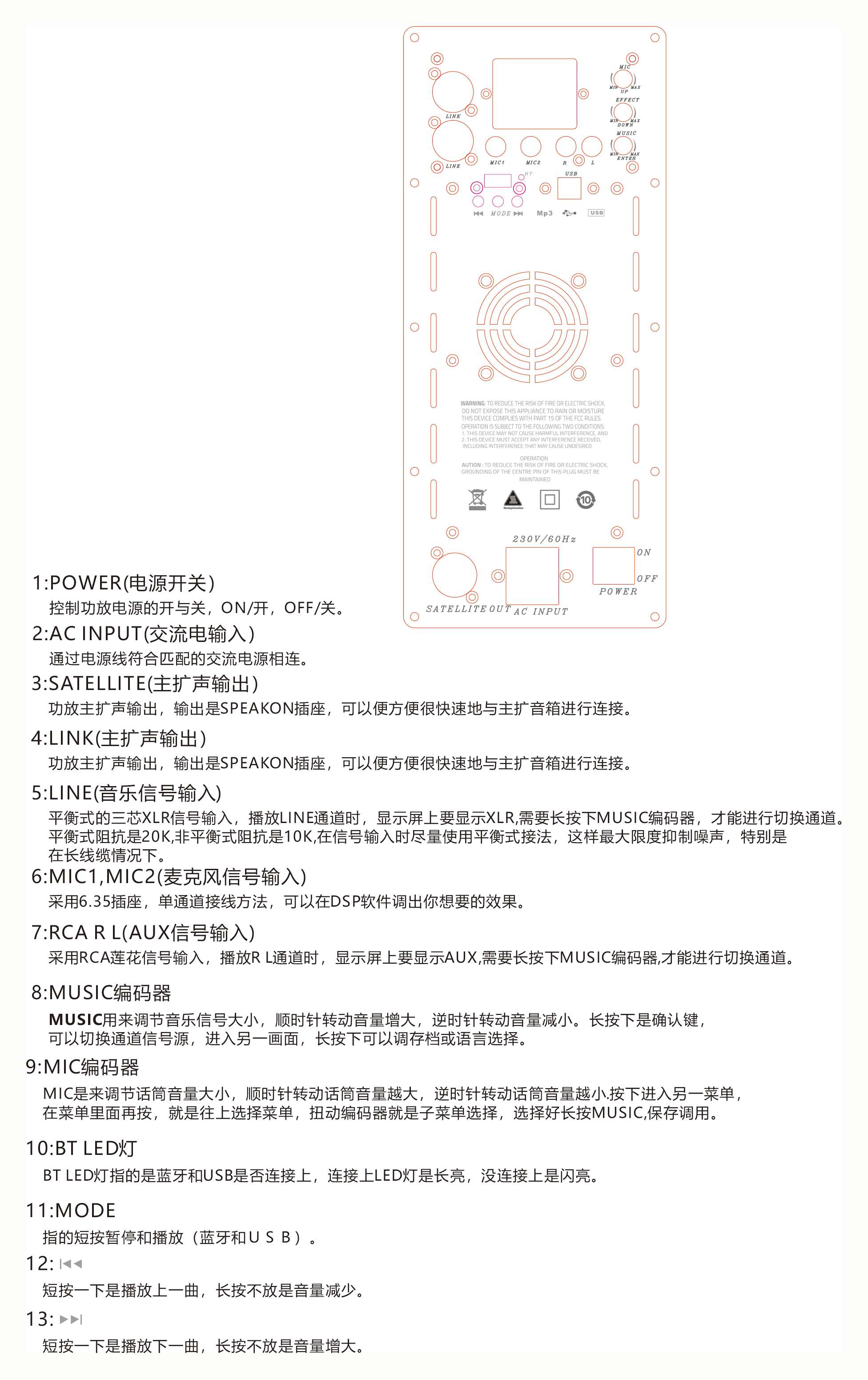 有源超低音箱接口:POWER(电源开关)、AC INPUT(交流电输入) 、SATELLITE(主扩声输出、SPEAKON插座) 、卡侬LINK(主扩声输出) 、卡侬LINE(音乐信号输入) 、MIC1 MIC2 话筒输入(6.35接口)、 莲花信号输入RCARL(AUX信号输入)、MIC旋钮、 EFFECT效果音量旋钮、 MUSIC音量旋钮、BE LED指示灯(显示蓝牙是否连接)、 MODE (蓝牙的暂停和播放)、蓝牙上一曲下一曲按键。